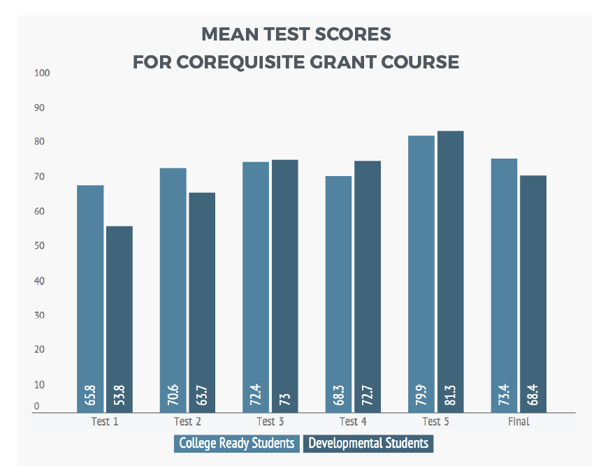 Developmental students who enrolled in the new corequisite grant course had a retention rate of 87.5%, while those who enrolled in the traditional developmental course had a retention rate of 72.2%.