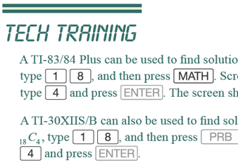 To further develop analytical skills, we encourage students to use technological resources to perform calculations for them so that they are able to focus on interpreting the output and understanding the contextual implications of mathematics. Tech Training boxes appear throughout the text, providing step-by-step instructions for using various technologies such as a TI 83/84 Plus calculator, Wolfram|Alpha, and Excel to solve problems.