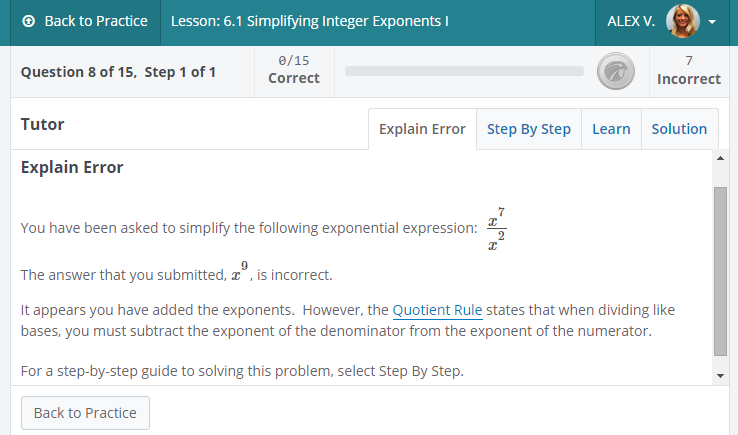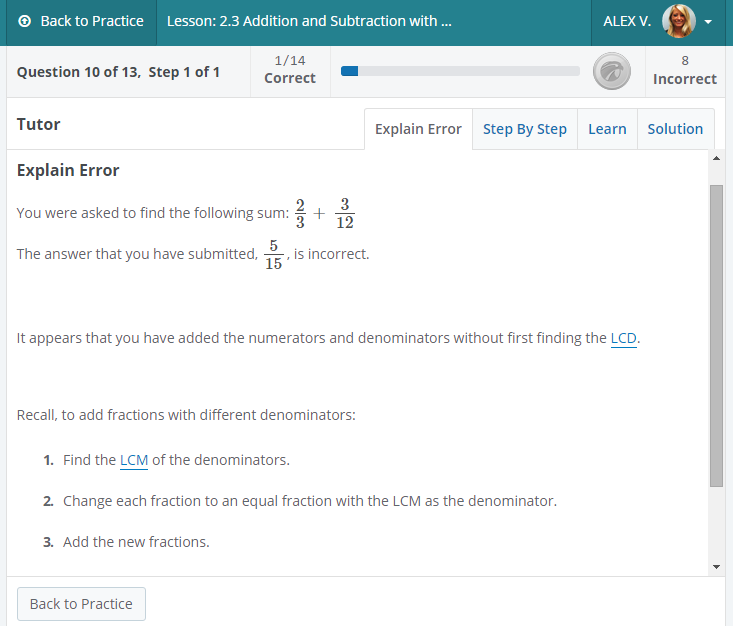 Understanding why an answer is incorrect is key to the learning process, and Explain Error allows students to learn from their own specific mistakes as soon as they make them. By addressing the error immediately once it is made during Practice, the courseware can prevent those mistakes from translating over to more high-stakes assignments such as quizzes and tests.