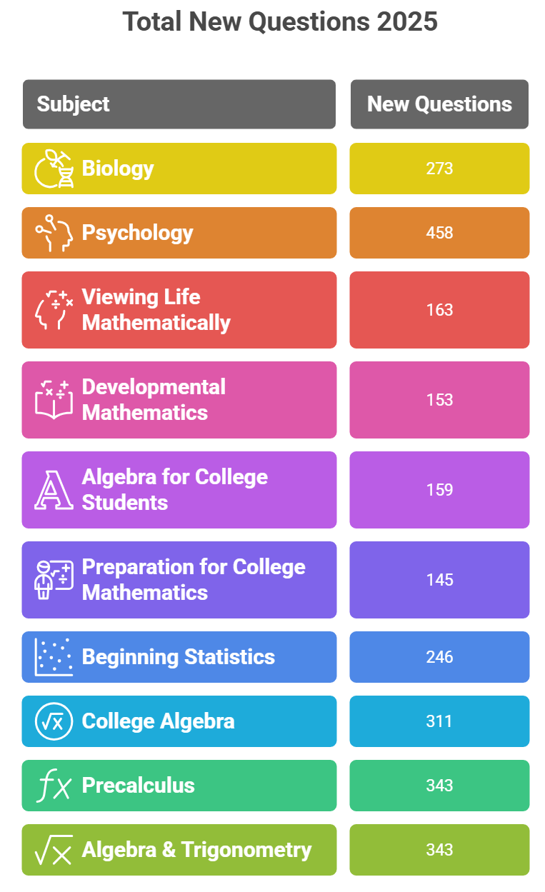 In just five months, we’ve added over 2,500 brand-new questions across multiple titles, with more coming soon! These additions include a wider variety of question types, difficulty levels, and broadened conceptual focuses, empowering you to: