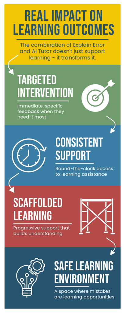 As education continues to evolve, tools like Explain Error and AI Tutor represent the future of learning support. They don’t replace educators – they enhance their ability to provide quality education at scale. By handling routine explanations and providing personalized support, these tools up instructors to focus on what they do best: inspiring students and facilitating deeper learning experiences.