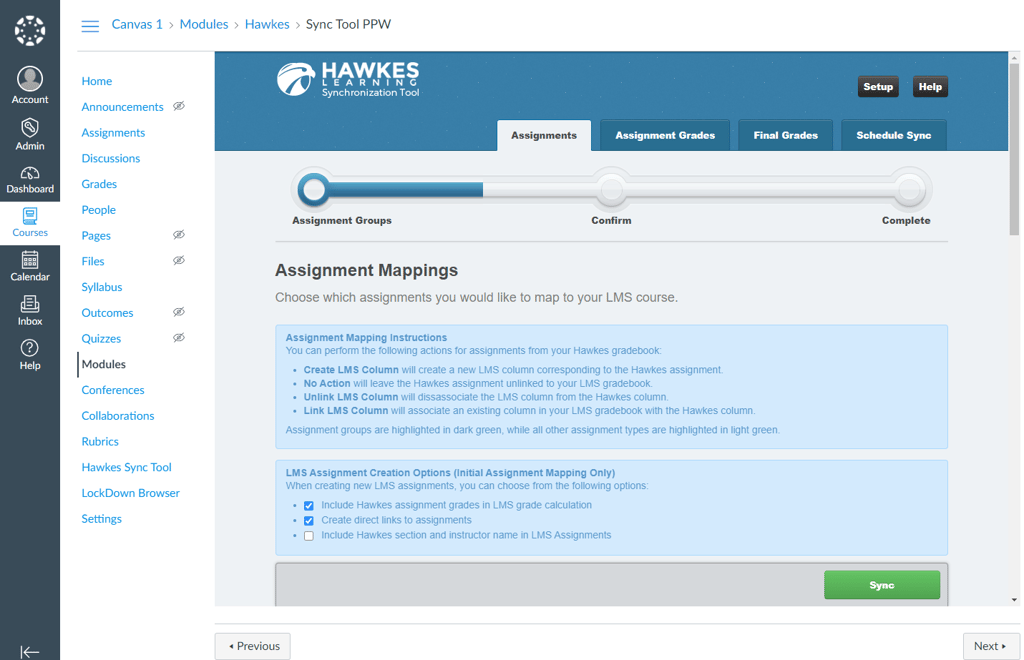 Assignment Grades syncs the grades for the assignments and/or assignment groups selected under Sync Assignments.