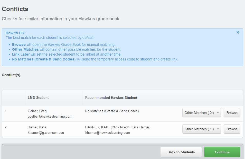 If any LMS students are missing from Hawkes, you are given the option to link the student and create a temporary access code.