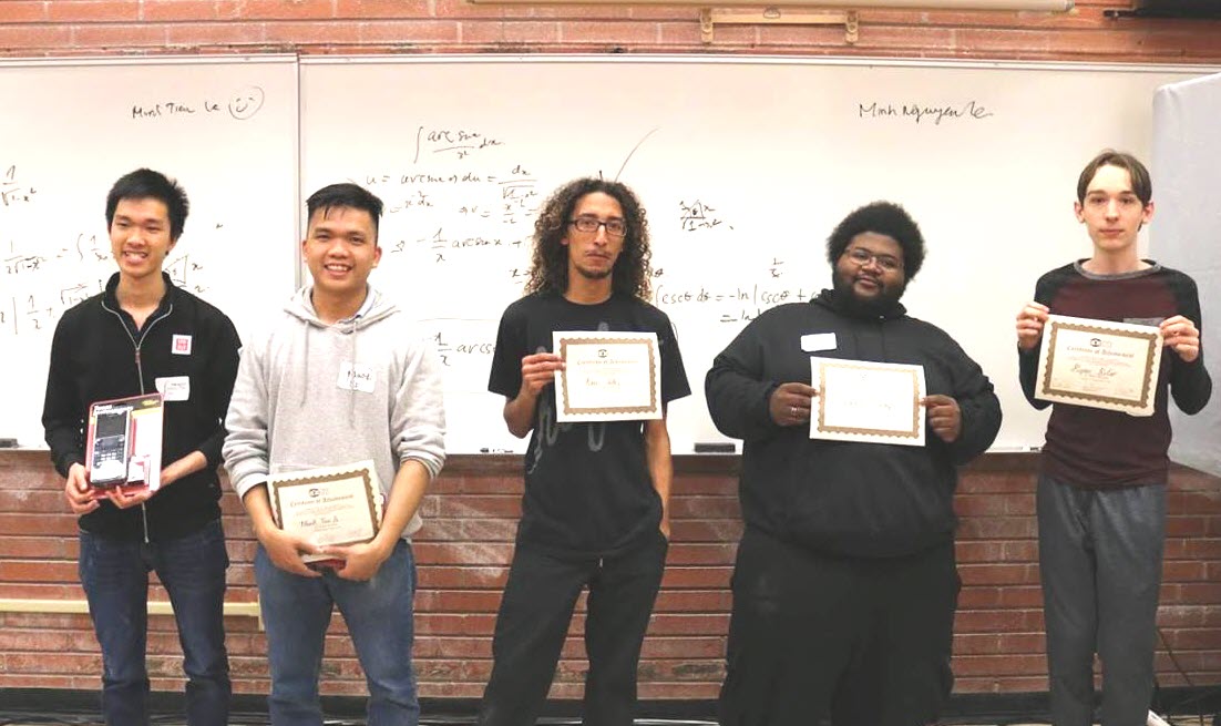 From left to right: 1 st place: Minh Nguyen Le (also the first place winner of the 2018 Integration Bee); 2 nd place: Minh Tien Le; 3 rd place: Raynaldo Tellez; 4 th place: Howard Turley; and 5 th place: Ryan Kelso.
