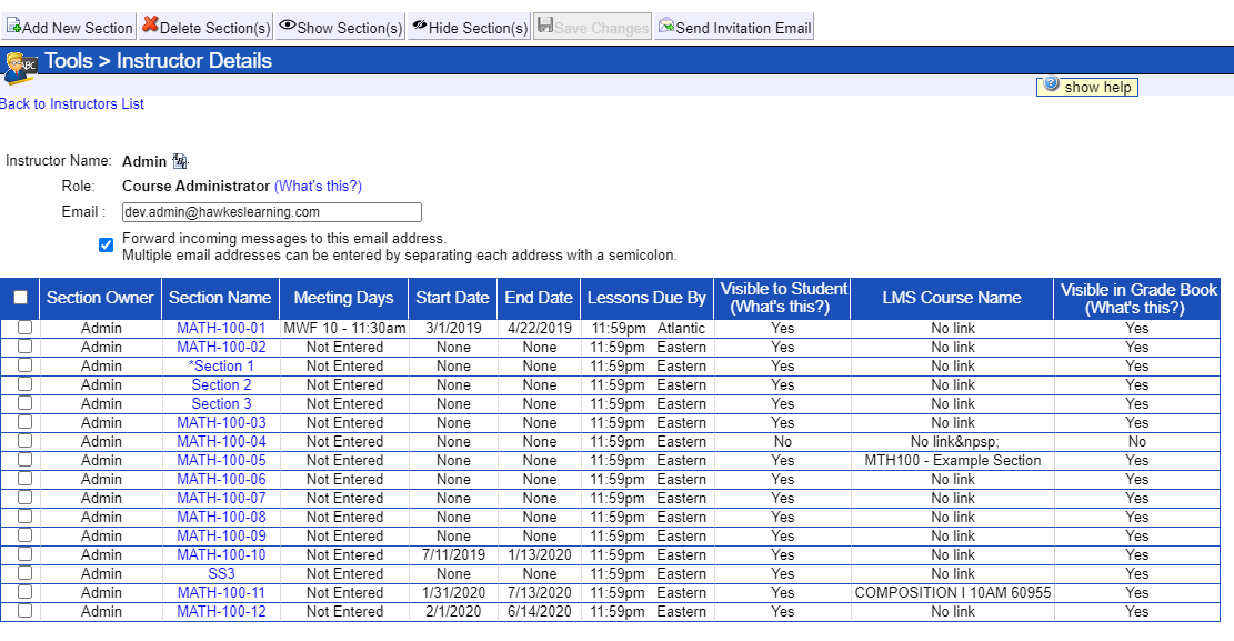 Instructors can now set a section as “Hidden” under Manage Sections in the Grade Book. This setting removes the section from all pages in the Grade Book except Manage Sections, Manage Students and Manage LMS Courses. All data and grades are preserved, but inactive sections will no longer interfere with easily identifying current sections when viewing reports or updating assignments/settings. If an instructor sets a section as “Hidden,” it also hides it from students for enrollment, as well as from Grade Book Course Administrators. Course Administrators can unhide any sections as desired.