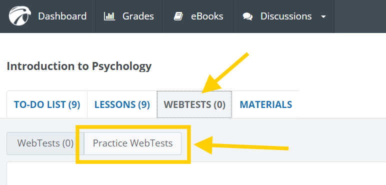 1. Access your course from your dashboard, then find the “WEBTESTS” tab. Once you click on it, select “Practice WebTests.”
