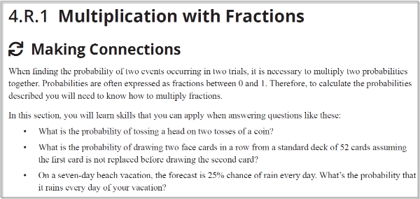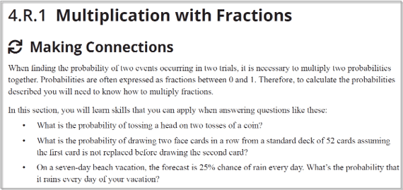 Making Connections: This introduction quickly contextualizes prerequisite skills learned in the coming pages, explaining the content’s relevancy to credit-bearing material.