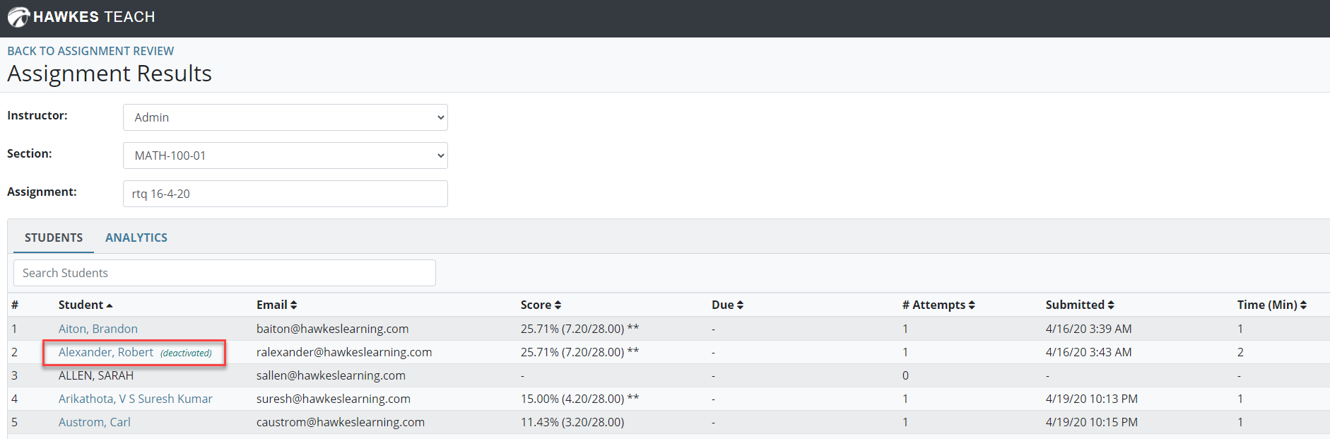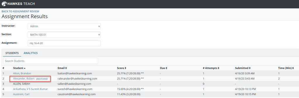 Assignment Reviewer now allows the option to review and edit scores for students with deactivated temp codes. Deactivated students are noted on the Assignment Results page.
