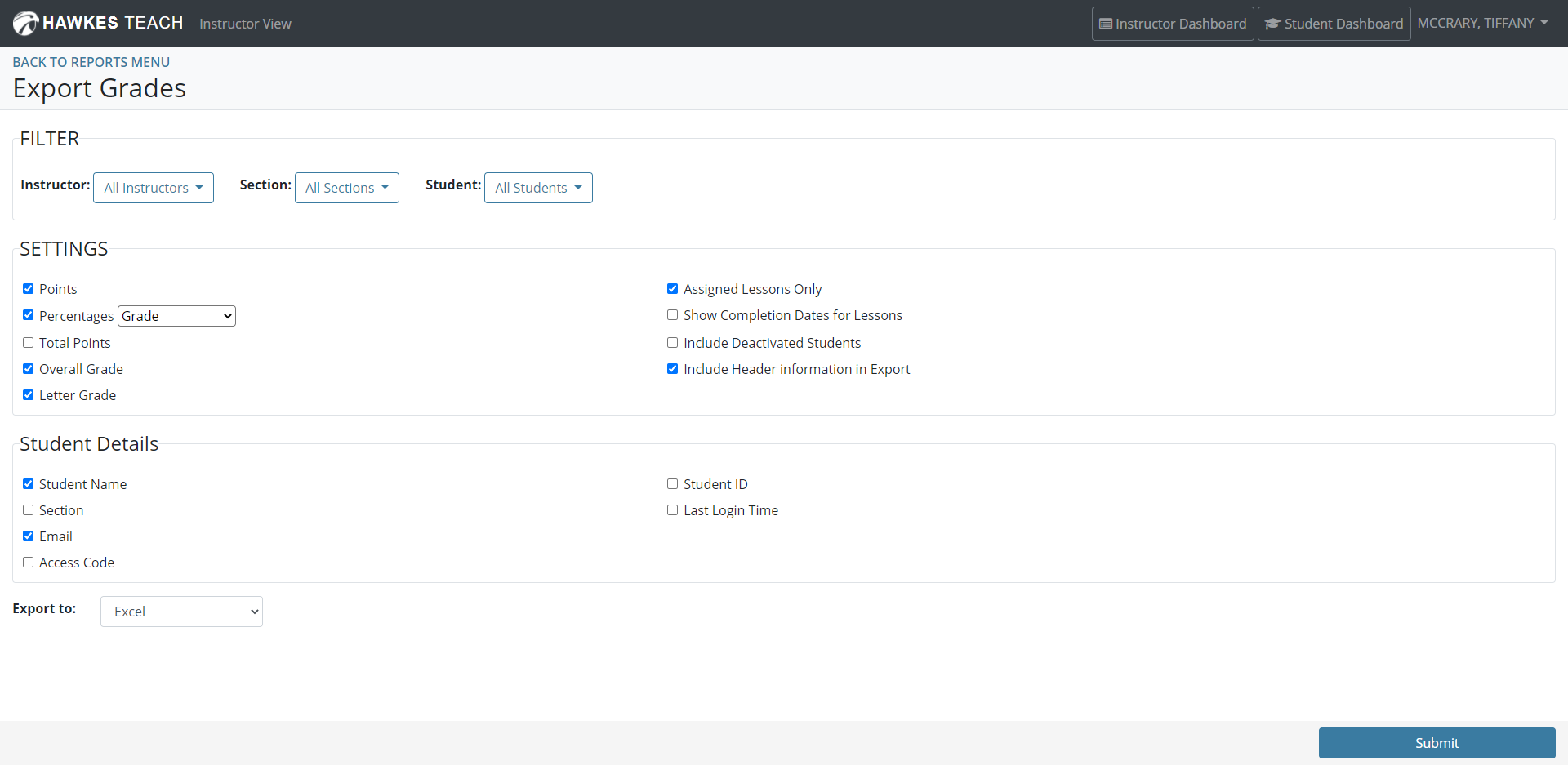 Course Administrators can select multiple instructors and multiple sections to export at one time.