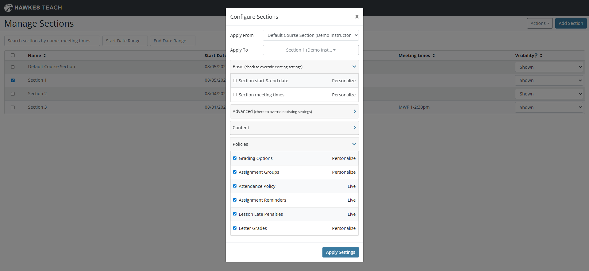 Simply create your new sections, then copy over all settings and assignments from another section—no need to start from scratch.