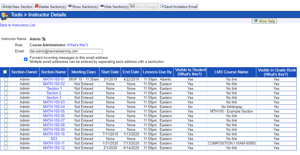 Instructors can now set a section as “Hidden” under Manage Sections. This setting removes the section from all pages in the Grade Book except Manage Sections, Manage Students and Manage LMS Courses. All data and grades are preserved, but inactive sections will no longer interfere with easily identifying current sections when viewing reports or updating assignments/settings. If an instructor sets a section as “Hidden,” it also hides it from students for enrollment, as well as from Grade Book Course Administrators. Course Administrators can unhide any sections as desired.