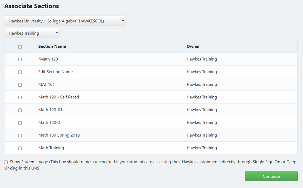 The Student tab in the LMS Sync Tool is now hidden by default to prevent the accidental creation of duplicate student accounts. Students will continue to link themselves when accessing Hawkes through the Single Sign On link or deep links. Instructors can elect to show this page during the section linking process, but they likely will not need to enable it.