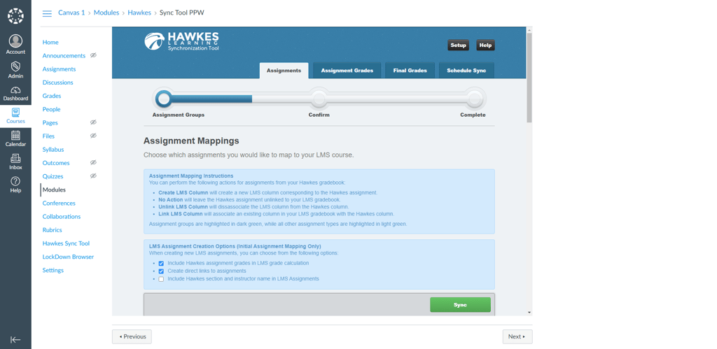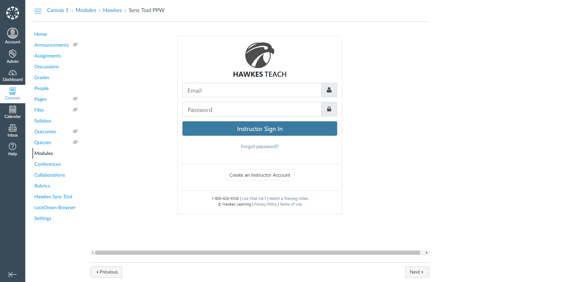 Instructors will now log into the LMS Sync Tool using their Hawkes Teach credentials. They will then be able to select from any Grade Books/Instructor Accounts that are linked to their Teach account to associate with their LMS Section. Note that Grade Book Course Administrators can select from all instructor accounts for any Grade Books linked to their Teach account. Instructors will no longer need to enter their Course ID or Grade Book password to link sections to their LMS.