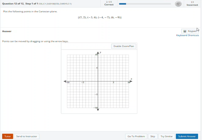 Students can now enable zoom in/out and drag/pan functionality for all Cartesian Graphs in Hawkes. Zoom in/out on area via double click, mouse scroll, Context menu, or keyboard shortcuts when the functionality is enabled. Students can also drag/pan a graph across the screen via click and release or keyboard shortcuts when the functionality is enabled. Draggable graph objects can be moved to any point within the graph regardless of the current zoom level. The graph will auto-pan with the point or object as it is dragged outside of the current viewing area.