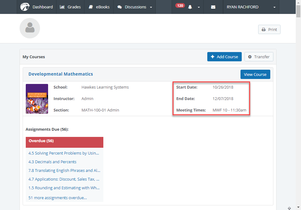 To help students quickly ensure that they are enrolled in the correct course sections, we have added section start dates & end dates, as well as meeting times, to Section Details on the Student Dashboard.